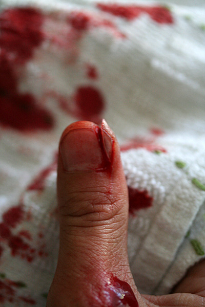 at first i felt pain and i knew i'd cut myself, just didn't know where. i looked down and didn't even quite know what i was looking at when i saw it. was that a flap of skin? but why is there a piece of fingernail attached to it? can you even slice fingernail like that? for a few seconds nothing happened. my body didn't even know what just hit it. then all of a sudden blood started to ooze out from the wound. shit shit shit, i thought to myself, this is bad. i ran to the kitchen to grab a dish towel before running to the sink where the blood was starting to drip off my hand. apply pressure to the wound, apply pressure to wound i repeated to myself, trying to stop the bleeding. i started to feel light-headed.