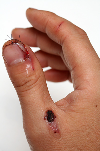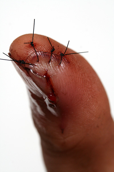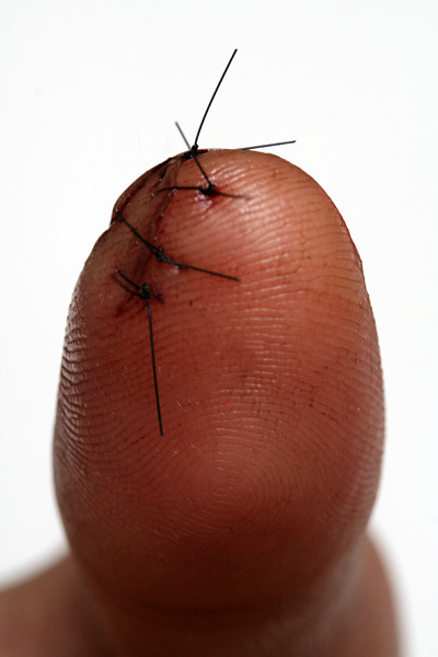 is it normal for suture ends to just stick out like that? i sort of want to vut them but maybe there's a reason why they're long like that. they remind me everything from whiskers, to the spines on a fly's body, to a bristly caterpillar, to the trigger hairs on a venus flytrap. they actually sort of function like real whiskers because i can feel them when i gently run my finger across them. my thumb looks pretty beat up and scary gross. i'd be embarrassed to go outside with my hand looking the way it does. some blood is still seeping out from a small crack in the fingernail, i hope that's normal. there doesn't seem to be any signs of infections. the fact that i'm not feeling any pain is probably a good sign. i haven't tried to flex my thumb yet, i'm afraid of rupturing the stitches or disrupting the natural bonding process. i also want to give my thumb a good washing to remove some of the dried blood but i don't want to make things any worse. i'm trying to imagine what my thumb will look like when it's healed and what kind of scar i'll have. i still have some stitching scars on the corner of my mouth when i slipped and fell at age 5. i look forward to adding another one to my small collection.