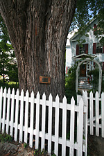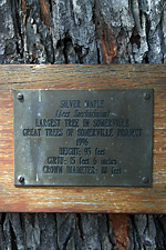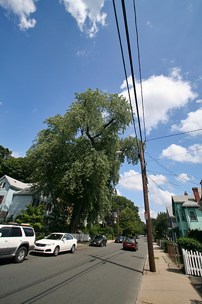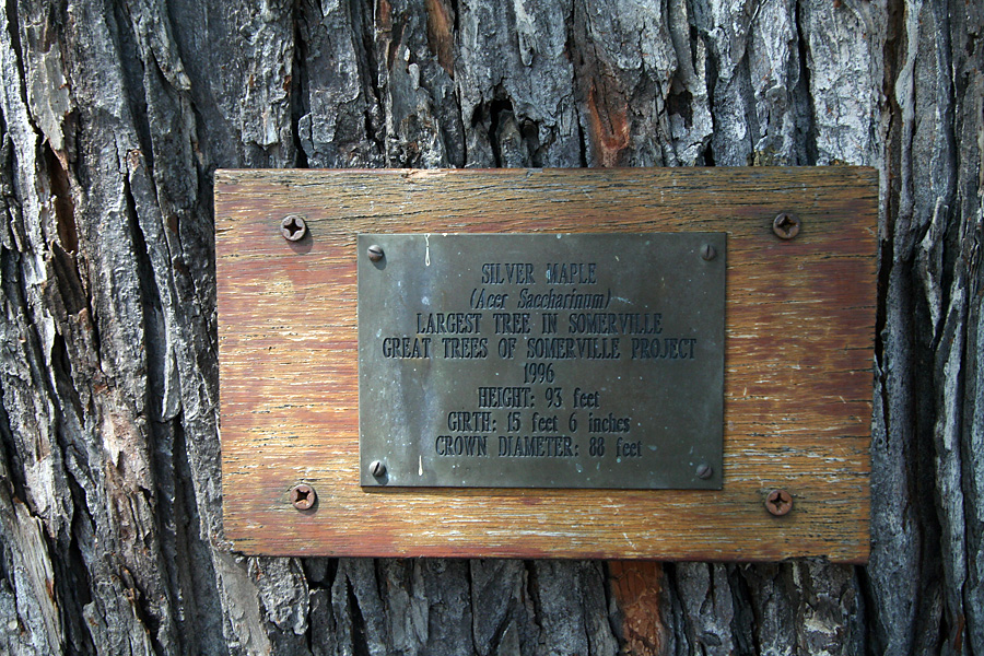 from davis square it was just a few blocks away from the largest tree in somerville located on morrison avenue (the street perpendicular from the somerville branch library). i heard about it one day while i was browsing the web, looking for the tallest tree in cambridge and somerville. while i couldn't exactly find what i wanted, i did find mention of the largest tree in somerville. the tree is remarkable enough to earn its own plaque, from the very mysterious "great trees of somerville project" circa 1996. notice how it's the largest, and not necessarily the tallest. if you want tall, the ailanthus tree behind petsi pie on beacon street must be 140+ feet tall. this tree however is most definitely the widest tree i've seen in all of somerville, a silver maple at that.