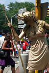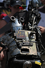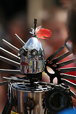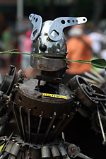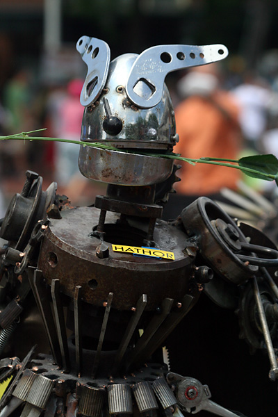 i told them there was some minor fluid build up underneath the dermabond and they recommended i go to my doctor ahead of schedule to get it drained if it gets any bigger. the last person i saw was jeff, who shouted my name as i walked right by him. each year's artbeat has a theme, and this year's was "somerville...of the future," but the only way anyone would have guessed that would be from the island of handmade robots. there was even a parade, which consisted of mainly children in just-made construction-paper robot masks and families in stilts. somebody behind me said something funny, "this must be how they walk in the future." i did talk with one vendor, a young soapmaker. i noticed she only had opaque soaps and asked if she ever made any clear soaps. she said they require a lot more work and are more dangerous to make, but hopes to one day graduate to the transparent soaps.
