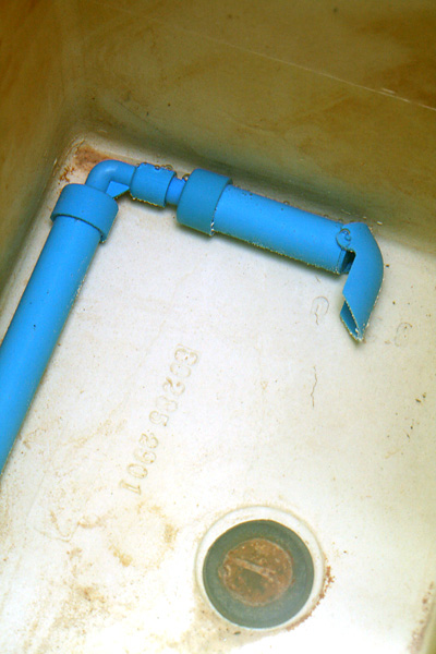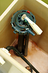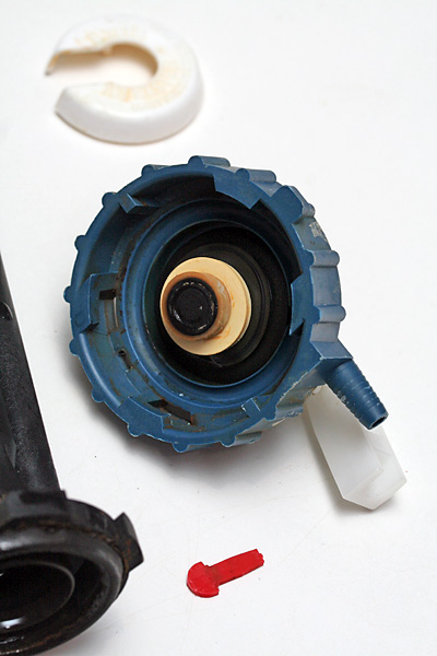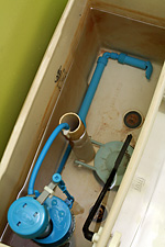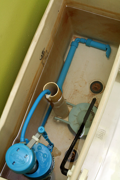 but i've removed the entire water tank before (in order to paint the wall behind the toilet) so this was easy in comparison. the tank was already drained, but there was still about half an inch of water at the bottom. i sopped up the last bit of water with a sponge, which included a lot of leftover reddish brown sediment from the previous fire hydrant test. with the tank now completely dry, it was just a simple matter of turning off the water supply and unscrewing the fill valve housing.