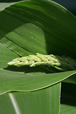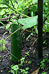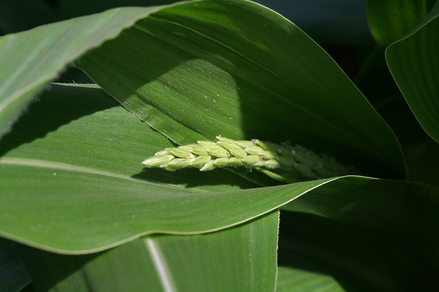 afterwards i watered the garden. one of the corns have already formed an immature ear (the female part of the plant). that means the plant is only halfway to maturity; it'll need to double in size before the male tassels will show up. once that's done and the silks have been properly pollinated, it'll take another while for the ears to mature. we're probably not going to eat homegrown corn until october. update 090801: what i saw were actually male tassels.