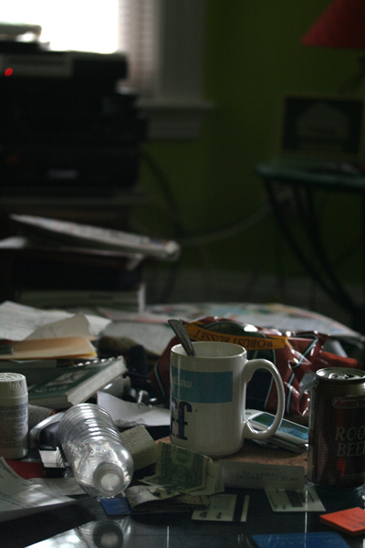 the living room table is a mess, despite the fact that i cleaned it just last week. it seems to be a depository of everything in the house, from loose change to receipts, to empty soda cans, dirty dishes, books, post-it notes, pill bottles, bills, and other miscellaneous items. i see it as a slackitude barometer; the more stuff that piles on the table, the more i'm just lounging around the house not being fully productive.