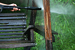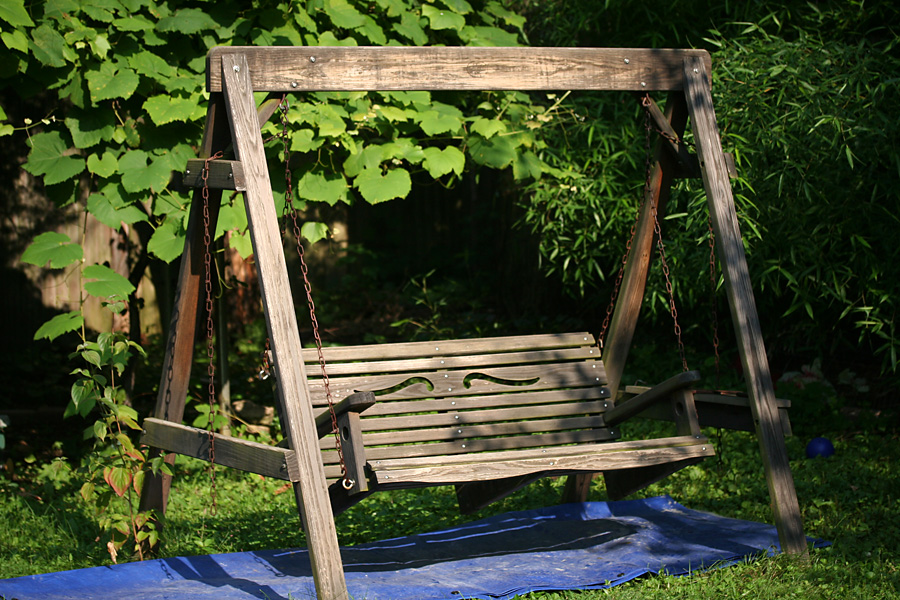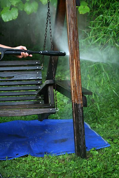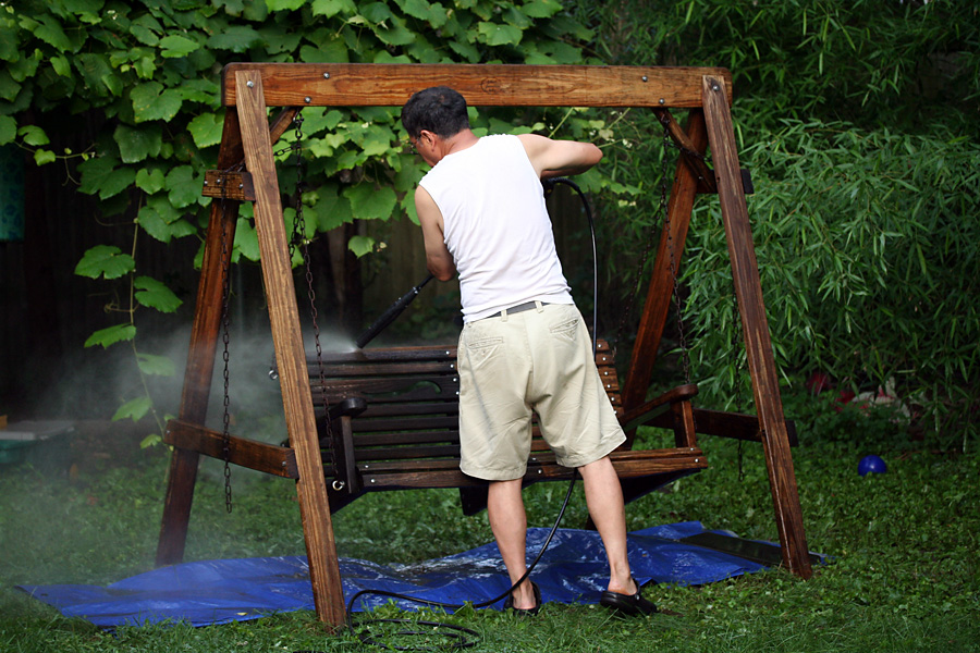 my father got a chance to use his favorite new piece of equipment, the pressurized water gun. after seeing the miracle it performed cleaning the bricks on the front steps a few months ago, my father took the spray to the wooden bench swing in the backyard, sun-bleached and covered in mildew and dirt. afterwards going to apply some australian timber oil to treat the wood.