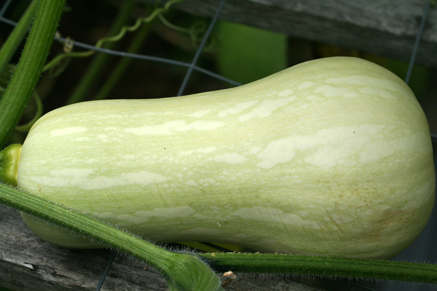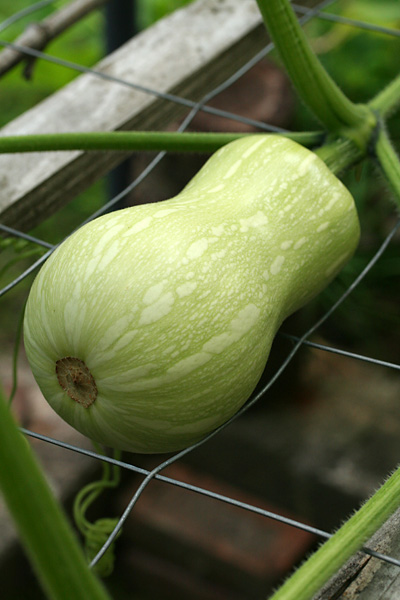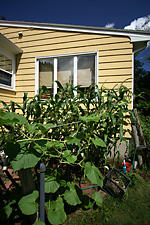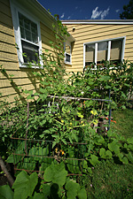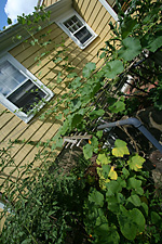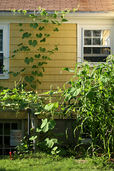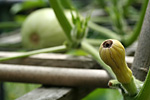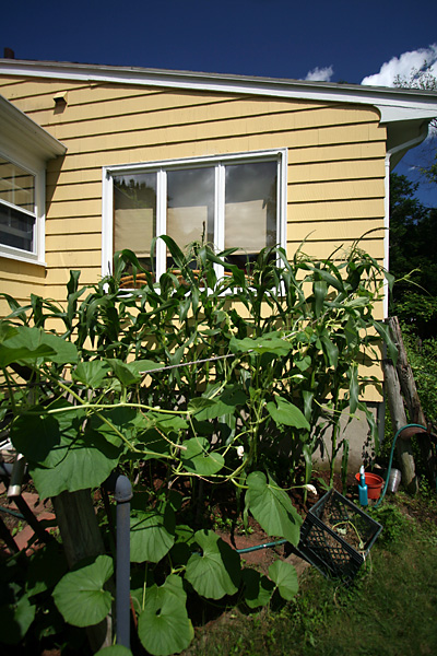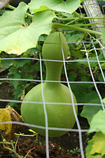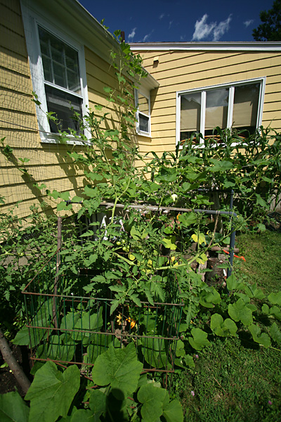 although the squash and gourd vines have taken up much of the garden, there's only been a couple of fruits: a single calabash gourd and 2 mystery squashes. i really think the mystery squash is a butternut. if that's the case, it'll be easy to figure out when the fruits are ripened because they'll eventually turn a yellowish orange. already the older of the two squashes have started to turn pale and lose some of its distinctive zucchinesque markings. a third squash on the vine looks to have been unpollinated and will eventually fall off. when i asked my father about it, he said he personally hand-pollinated that one flower twice, but nothing happened apparently.