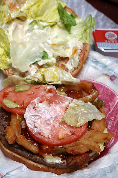 i had dinner in belmont in the form of burger king. i had their new angry whopper, which is a spicy burger with jalapeño pepper slices. i went with my mother to pick up the food. there was a mix-up with the order: when i told them i wanted onion rings instead of french fries for all the meals, they thought i meant onion rings and french fries inside all the burgers (i didn't even realize that was an option).
