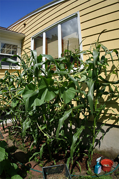 i was in belmont briefly wednesday afternoon, and some the corn stalks were already taller than me. it's hard to imagine, but in just 2 days they've gotten even taller, approaching 7 feet. most of the tassels are out, but the female ears and their corresponding silks have yet to fully develop. i figured we're not going to be harvesting any corn until probably october-november, although they grow pretty fast, so i could be wrong.