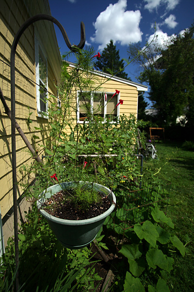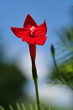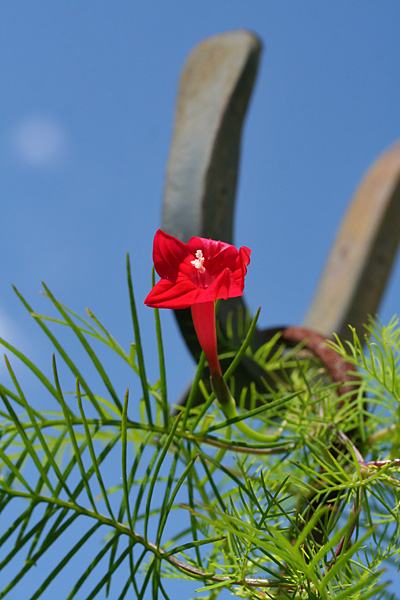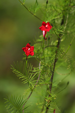 the cypress vine has finally bloomed, producing these small red star-shaped flowers on feathery green fern-like leaves. a pretty plant, i just wished more had germinated than just that one plant (although a single plant can still put on a pretty good flower show). something about the red stars make me associate this plant with communism (i also first saw them while in china).