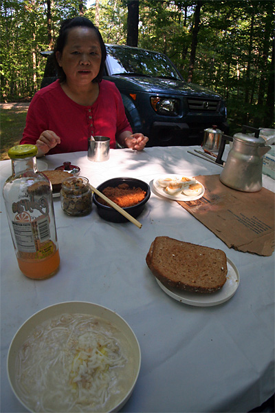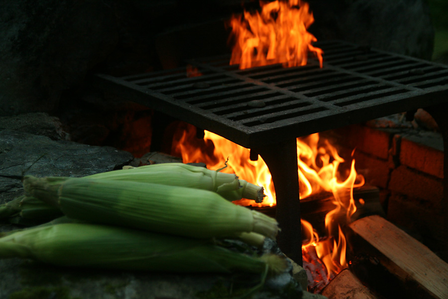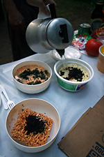 it was 6:00 by the time we made it back to our campsite. unlike the day before, we had plenty of daylight left to work with and weren't rushed. my father built a fire and my mother started preparing dinner. we had barbecued corn and instant noodles (sprinkled with dried seaweed).