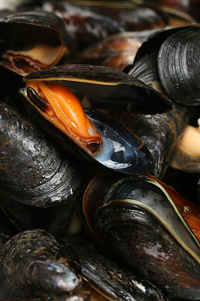 i picked up a bag of prince edward island farmed mussels for dinner. my father is always the one who cooks them because he has the expertise. using a large flat-bottom pan, he first melts half a stick of salted butter with a whole chopped head of garlic. he then dumps in the mussels while at the same time adding a cup of white wine, quickly covering up the pan to let the shellfish steam-cook. once the mussels open up, they're ready to eat. the last time we had mussels they were on the bland side, so this time around my father added half a teaspoon of salt, which made everything taste a whole lot better. in fact, he couldn't get over how delicious these mussels were and kept on saying how great they tasted throughout the course of dinner.