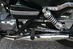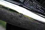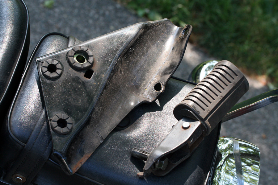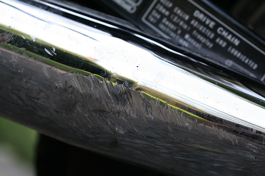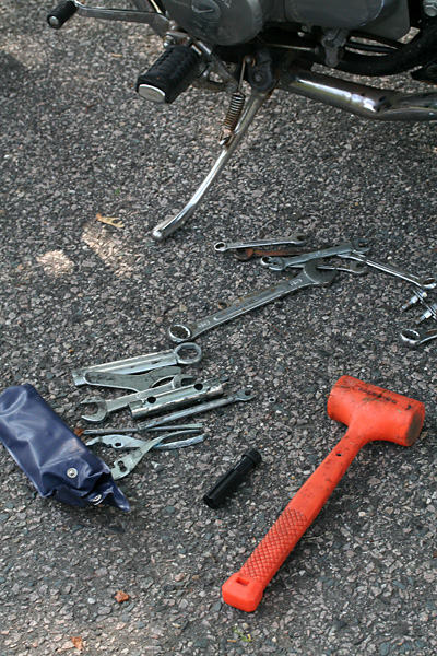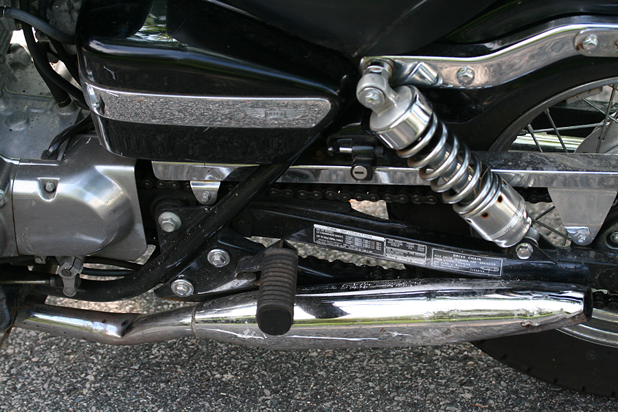 i got a chance to further examine the motorcycle when i arrived in belmont. i knew the left-side muffler was bent and pushed into the bike. what was causing that grinding sound was the noise of the drive chain rubbing up against the muffler bracket, also smooshed into the bike. i couldn't bend the muffler exhaust tube (chrome-plated steel, go figure) but if i could remove the muffler bracket then it wouldn't grind against the chain and i could theoretically ride my motorcycle again. it took a whole series of tools, banging on the muffler with a rubber mallet, crawling on my back to loosen a few nuts beneath the bike, greasing up my hands, bloodying a knuckle or two. after that was done, i washed the bike. although i could ride for short trips, the motorcycle definitely needs a visit to the mechanic, and i didn't want the bike to be dirty when it did. at least now there isn't a rush to get it fixed for riding, i can take a few days to sort out the insurance and claim adjustment. i was thinking i could finally get back into bicycling again, but i'll have time for that when the motorcycle goes into the shop for repairs.