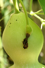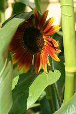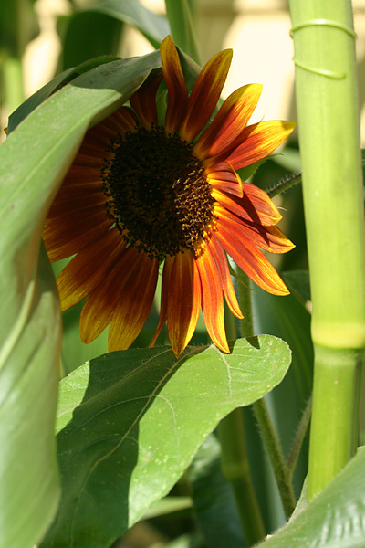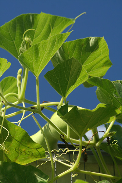 inspecting the garden and taking photos. there are even more bottle gourds than last weekend, and one of them has gotten so heavy (easily weighing several pounds) it's already sunk to the ground, tugging at the rest of the vine. elsewhere, a single sunflower has bloomed amongst the corn field. normally it'd be the tallest thing in the garden, but this season it's easily dwarfed by the much taller corn stalks.