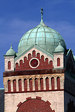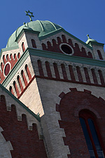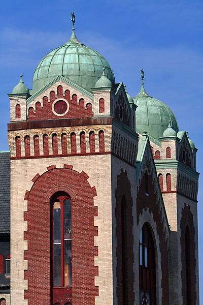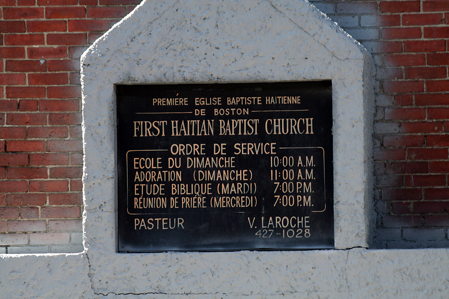 with my bearing restored, i rode north up blue hill avenue. i passed by another new york fried chicken (442), apparently they're a chain. at 397 i was compelled to stop when i saw this strikingly impressive church. the stars of david on the bulbous steeples hinted this might be a synagogue, but the sign said this was the first haitian baptist church. like many older buildings in boston, this one also has a history. it was in fact originally a synagogue built in 1905 (late romanesque revival style) when the area had a large jewish population, before they all moved away. it was sold to the ecclesia apostolic in 1967 then sold again in 1978 to the haitian baptist.