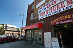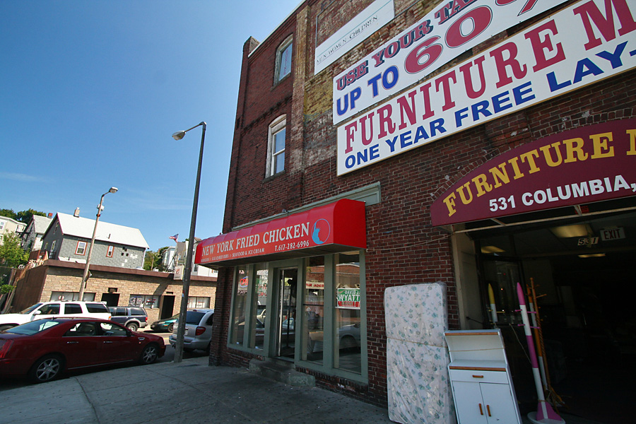 i ended up back on columbia road, heading in the opposite southwest direction this time. at the intersection of columbia and hancock i noticed a new york fried chicken restaurant. figuring i would never find poppa b's (1100 blue hill avenue), i decided to settle and try some new york fried chicken. instead of a nice restaurant, it was essentially a takeout place, with just an empty counter to eat inside. the signs were faded and the selections were few, and although the food didn't seem particularly appetizing, i braved on, deciding to risk it, and asked the indian guy for the 3 piece fried chicken with 2 biscuits - all for the cheap price of $3.25. i asked him if he knew where blue hill avenue was. he hooked his finger and pointed, "down there, keep on going, you'll hit it eventually." outside, a large man loitering by the entrance asked what kind of lens i had on my camera. i asked him for directions as well, and he told me the same thing, keep going down columbia road, eventually it'll intersect blue hill avenue.
