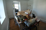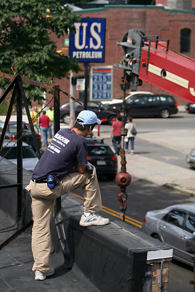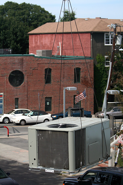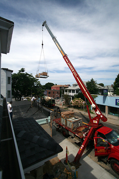 that the single primer coat was good enough. nevertheless, i'm coming back tomorrow to do a 2nd layer for my own personal satisfaction, flat white on the walls, semi-gloss on the crown molding and baseboards. the one piece of excitement came in the form of a crane truck delivering some industrial air conditioning units to the renovating restaurant next door.