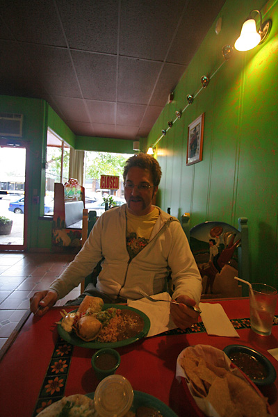 a lot of flash, a lot of colors, featuring the most interesting wooden carved chairs with painted cowboys riding bucking broncos. i had the fish taco, brice had the chicken chimichanga. i never had fish tacos before, it was pretty tasty. it was our first meeting since he'd been laid off earlier during the summer. i got some more details as to what happened and he filled me in on what he'd been doing since then. we stayed and chatted until 2:00 before we left.