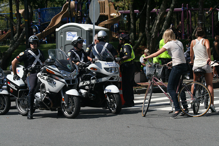 there weren't as many spectators compared to past years, which is surprising, given the good weather and the opportunity to ogle scantily-clad men and women. maybe the later start date confused a lot of potential parade goers. instead of following the procession down to kendall square, i got on my motorcycle and went home. i didn't leave empty-handed however: earlier i bought a yard sale bicycle helmet for $2 (giro flak).