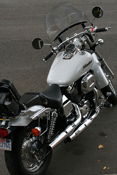 my qualms with the honda spirit is only when it's parked; when i'm riding it on the road, i have no complaints. the bike was still backfiring and i had to ride in full choke until we can change the oil and maybe drain the gas tank of the old fuel, but the engine didn't kick out today. other than that, the bike handles smoothly, very stable (more like a car; my old honda, that was more like a bicycle with an engine). the bike just wants to go fast and makes me itch for highways, something that never happened with my old bike.