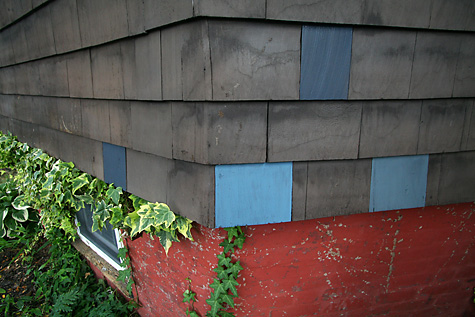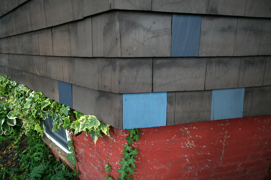after lunch i went to belmont briefly to see the chipmunk hole in the garage before returning home and tried out the new stain. i definitely like it more than federal blue and foothill, both of which were too light. slate grey has the perfect combination of blue and grey, and just the right saturation level to not be too light nor too dark. at this point i'd be happy to see the house in this color. now i just need to get my neighbor steve's approval or entertain his color choice. once that's done, we still need to decide on the trim color.