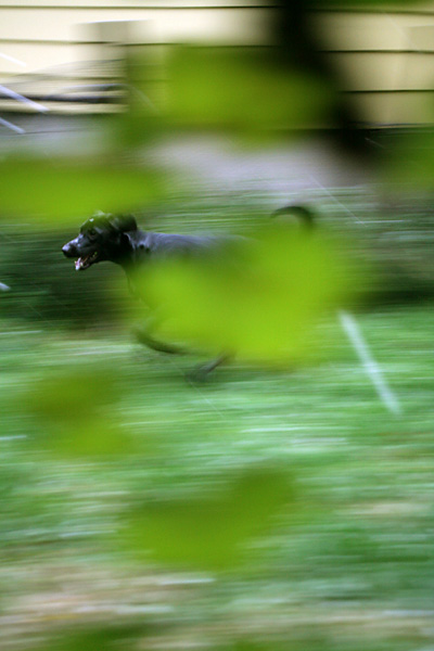 making dog tracks in the already muddy lawn. normally it's hard to get her back inside the house, but now it was impossible. i tried grabbing her as she ran by but she was too slippery from the rain. not even bribes of dog treats had any effect. finally my sister and i trapped her in a corner of the yard before getting a leash on her.