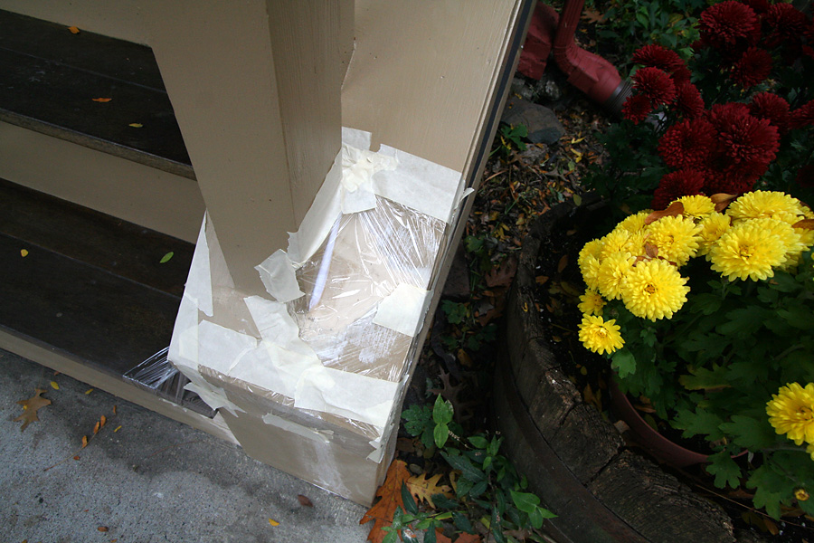 finally back at home, i caulked up the porch. the problem was with rain forecasted for later tonight, i couldn't afford for everything to get wet. so i improvised and sealed everything up with some plastic wrap and tape. hopefully it'll keep out enough water for everything to dry. maybe cleber was finally show up tomorrow to finish painting, but if not, i can probably do it myself next week.
