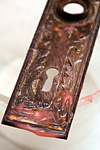 i'm still stripping the mortise locks. the residual paints on the back plates from the bathroom door are especially stubborn. even after tonight's 5th stripping, some of the paint still isn't coming off. at least i had the foresight to get some disposable gloves from the cafe, so i wouldn't have to ruin my hands. i tried soaking the name plates in some paint thinner, but that didn't seem to do anything, and the smelly clean-up made it not worth it to try again. i'm doing a 6th coat of citristrip then, leaving it overnight to see if that will help with the last of the paints.