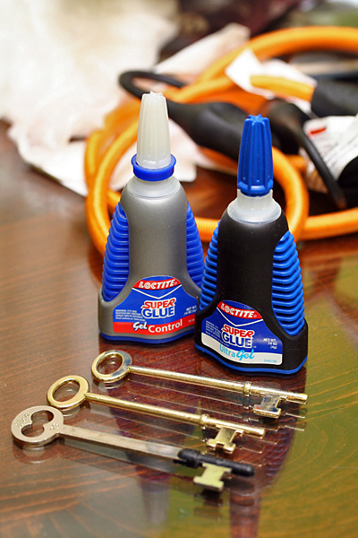 i was at home depot earlier trying to find a good glue for bonding metal and to look for replacement skeleton keys. the glue was for one of the mortise lock that had a broken edge on the body. home depot had all sorts of epoxy glue, but i didn't like any of them because none of them cured clear (usually a tan or white color is the norm). i ended up going with a heavier strength super glue, the loctite super glue ultra gel ($3.89), which was advertised to be impact resistant. as for the skeleton keys, i didn't see any at the mini locksmith bar but decided to ask anyway. the guy behind the counter said, "yeah, right there," and pointed to a package: a pair of bass plated skeleton keys for $1.97! and i paid $5 for the one i got yesterday!