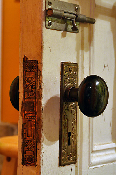 there was hardly any paint left, i just wanted to see if i could get them even shinier without having to resort to a harsh scrubbing brush that might mar the details. i then put them back onto the doors. now the doors definitely need to be stripped and repainted, but like i said before, that won't happen until next spring.