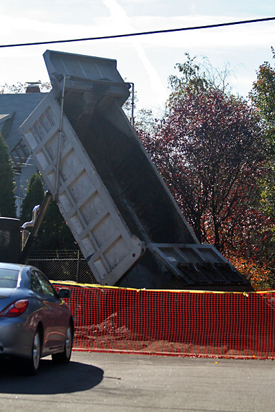 in the early afternoon, with the construction noises still going on, i got dressed and went out to investigate. on the street directly behind my house was a large dump truck unloading a mound of dirt into what looked to be an empty lot. i wanted to ask somebody what was going on but the only person there was the driver of the truck who narrowly missed running me over as he was leaving.