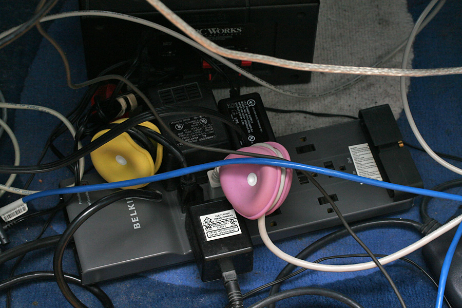 in the evening my latest order from amazon.com finally arrived. included was my new belkin 12 outlet surge protector. the one i have in my bedroom/home office is a curtis 8 outlet surge protector. that one works fine but my only complaint is i'm still always unplugging things because 8 outlets just isn't enough to drive two desktop computers, a laser printer, speakers, lights, ethernet hub1, and a host of other peripherals. i'd been eyeing the belkin for a while, until last week i noticed there was a temporary price drop to $20, so i finally bought one. the only problem is the wall outlet is behind a large bookcase in my bedroom, and in order to reach the outlet, i basically had to remove everything from the shelves. so now my bedroom looks like a hoarder's nest, with stacks of books and papers and discs. i'll organize everything tomorrow.