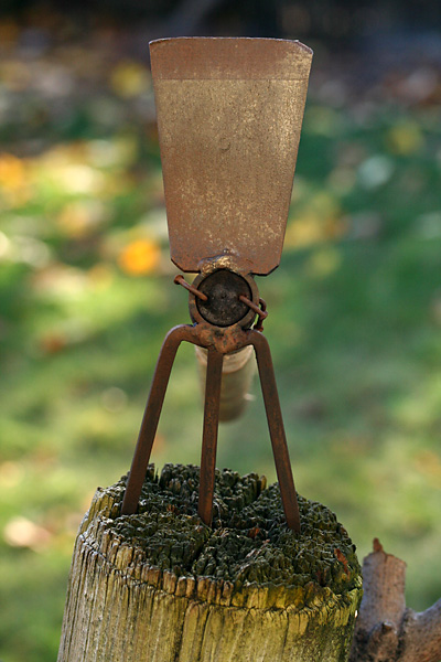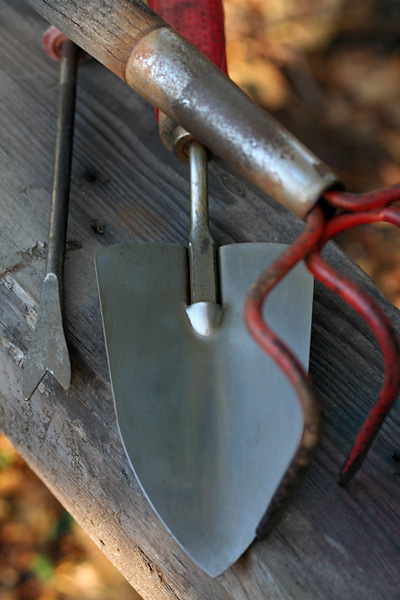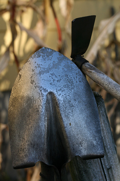 hailey was home alone. i let her out in the backyard, where she assumed her usual position underneath the trees guarding the house from squirrels. i had the bad luck of stepping on a pile of dog poop and spent some time scuffing my shoe on the lawn to clean up the mess. my first project was to clean up the garden tools. i sprayed everything with some WD40 then scrubbed away with a steel brush. i washed off the rust, then continued polishing with some steel wool. some tools cleaned better than others. tools that'd been sitting outside for many years were too rusted to clean in one sitting.