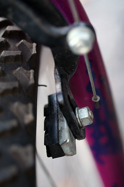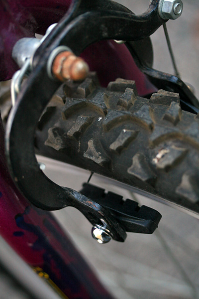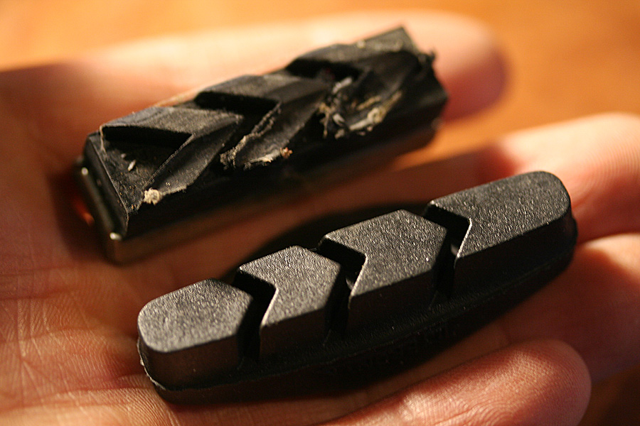 i tightened the caliper brakes, degreased the gears, and removed a tiny bit of rust with a brass brush. since it's never really been ridden before, the bike is in pretty good shape. the only thing missing is a rear cargo rack. i gave the bike a test ride up and down the street. the thing i noticed right away were the squeaky brakes. i took off one of the brake shoes and saw that the rubber had completely hardened.