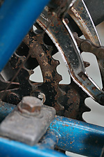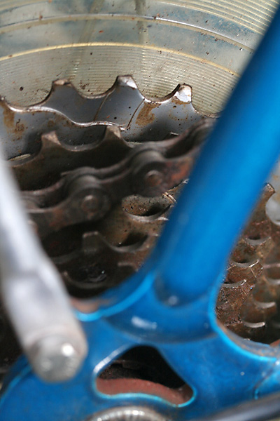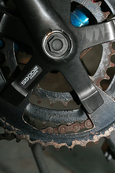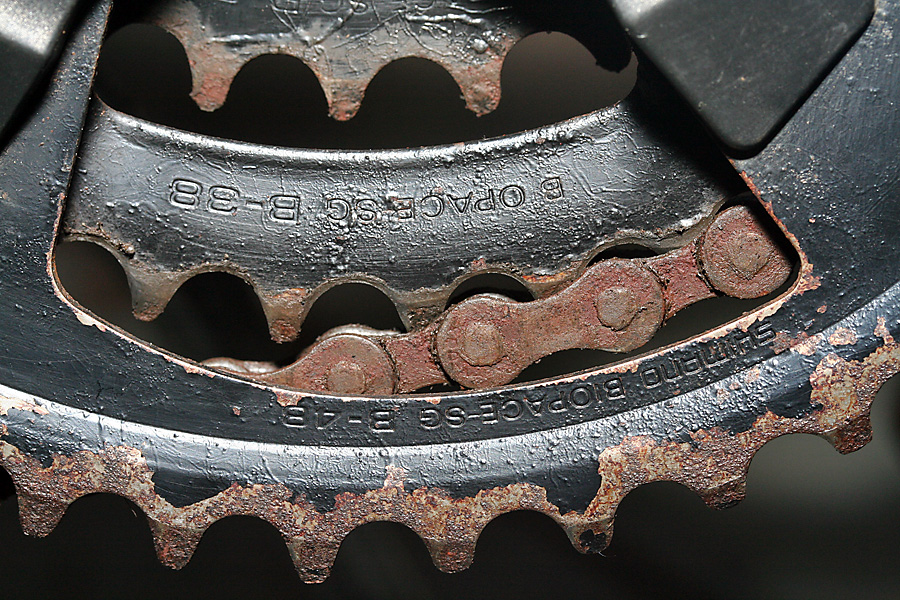 i brought out my bicycle for some further inspection. i particularly wanted to know the exact specifications of my crankset in case i wanted to replace it. looking at the chainrings, i noticed some broken teeth in the middle gear. i wonder if i should replace the crankset as well when i eventually replace the chain? the crankset seems to be fused together, i don't think i can replace just a single chainring. the one i have is a shimano biopace, which from what i've read, is actually oval-shaped instead of round. it's specially designed for pedal stroke efficiency. i managed to unscrew the crank nut (a creative use of a 14mm socket wrench and the heel of my shoe) but still couldn't put out the crankset. either i need an additional tool or it's too badly rusted. i didn't want to pull it anyway because i still needed to use the bike. i put everything back together and continued with my errands.