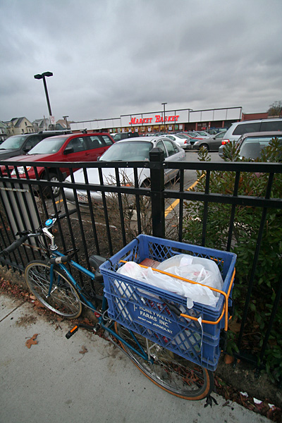 fearing the crowd at market basket with just a few days left before thanksgiving, i was surprised to see it wasn't that crazy yet. i bought a case of root beer (got to have my root beer with my turkey), a gallon of milk, a dozen eggs, a carton of juice, and a custard pie. there would've been no way i could've carried all that home in just a backpack (eggs? pie?), thank goodness i had my milk crate basket! i had to be careful, because the back end of the bicycle was prone to swaying due to the additional weight, but once i got the bike going, i hardly noticed the difference.