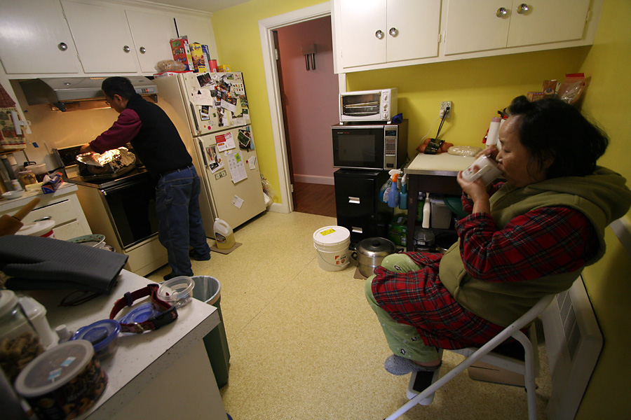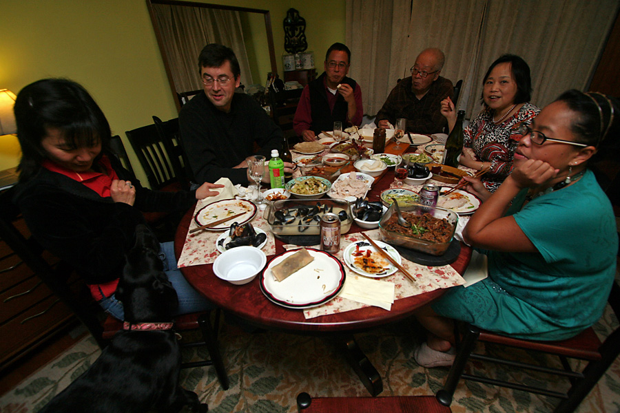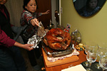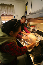 the 22 lbs. turkey ended up taking more than 4 hours in the oven. my parents stuffed it with glutinous rice but there wasn't enough juices to cook the rice completely. tin foil covered the bird for the first 2 hours then was removed for the final 2 hours. originally we were going to take hailey out into the woods for a walk, but with all the cleaning and cooking, there wasn't any time. my aunt and uncle arrived sometime after 5:00 and my father went to go pick up my great uncle around that same time.