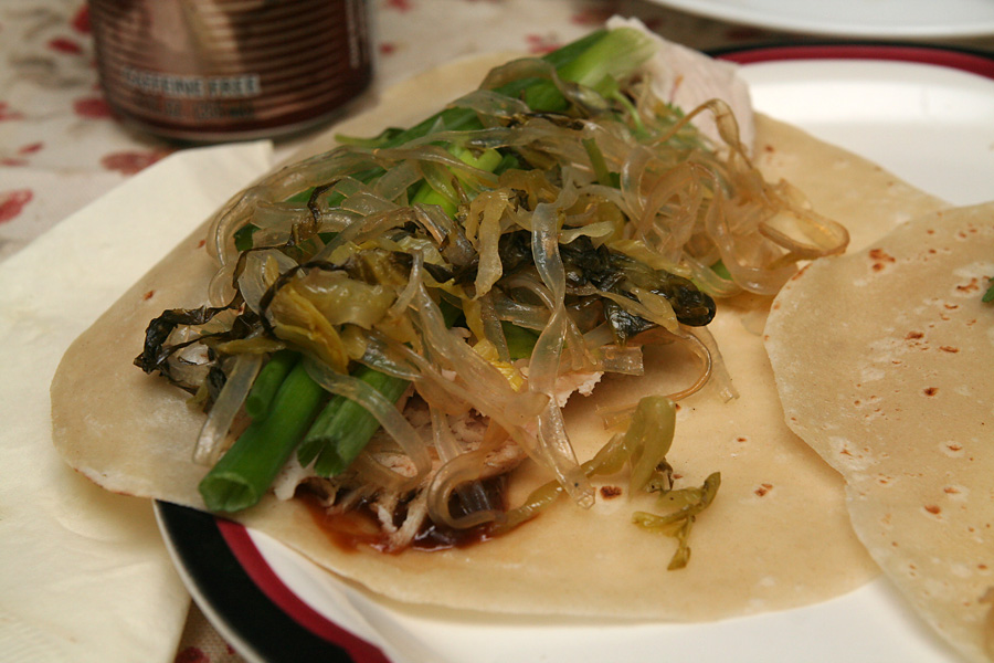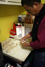 there was very little drama this thanksgiving, partly because we had so few people. the only sour note was hailey's bullying of my great uncle: every time he left his seat, she would start barking. the television was on, tuned to the cowboys-raiders game. matthew said i could borrow some of his bike repair equipment, including a wheel truing stand. the turkey was larger than what we needed so we only managed to eat half. i myself only had 2 turkey rollups, one of the staples of thanksgiving. my father drove back my great uncle after dinner, but came back to join everyone for dessert: giant asian pears and flan. there was also a dessert soup that i didn't get a chance to try (often the case with these thanksgiving meals, there's so much food that a few items always slip through the cracks).