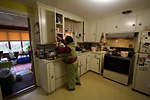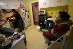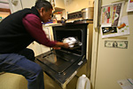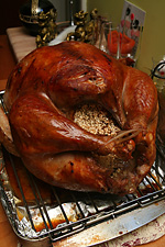 i took the motorcycle, figuring i might not want to bicycle back after having a big meal (or maybe i would, just to get a head start on shedding those extra calories). the house was much cleaner that yesterday, but still needed some decluttering. my main job was to sprinkle some carpet deodorizer and vacuum the rugs in the living room. i found the automatic carpet brush head for the old hoover vacuum which made it much easier. my father came back from fixing lunch for my great uncle around 1:00 and we finally put the turkey into the oven.