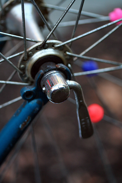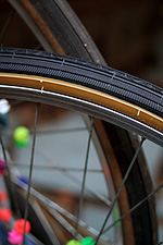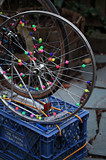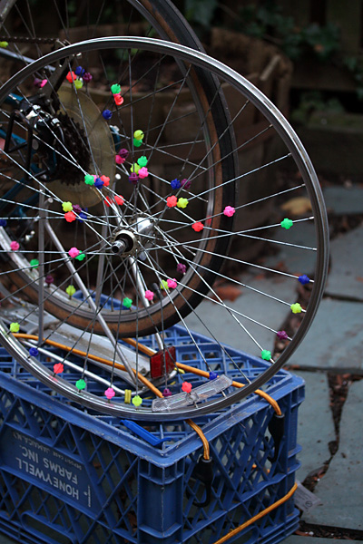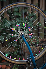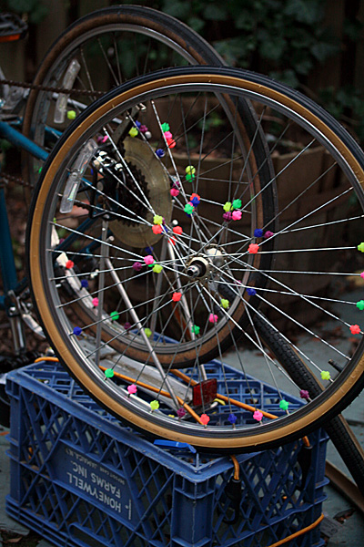 later in the evening, after looking over my photos, i went down into the basement and removed the front wheel we'd been fixing earlier. from the pictures i noticed the tire was sitting too low inside the rim, and thought maybe we didn't install it right. but after adjusting it for a while, it seems like the tire was designed that way. i did take the opportunity to remove the spoke beads though. customization is one thing, but that was gussying up gone wrong. i'm hoping to remove the spoke beads from the other wheel when i get the chance.