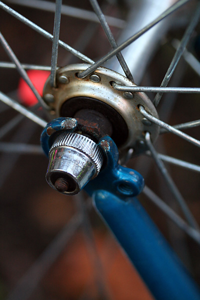 my father called me in the early afternoon, said my uncle matthew came by and dropped off a bunch of bicycle repair equipment. i dug my bicycle out from the basement and rode down to the cafe. there was a truing stand, a spoke wrench, a reflective armband, a chain tool, a bike computer (missing the spoke magnet), a container of chain lube, a copy of "the bicycle wheel" by jobst brandt, and a set of panniers. not included was a crank remover tool, which i will have to acquire somehow if i want to replace my rusted broken crankset.