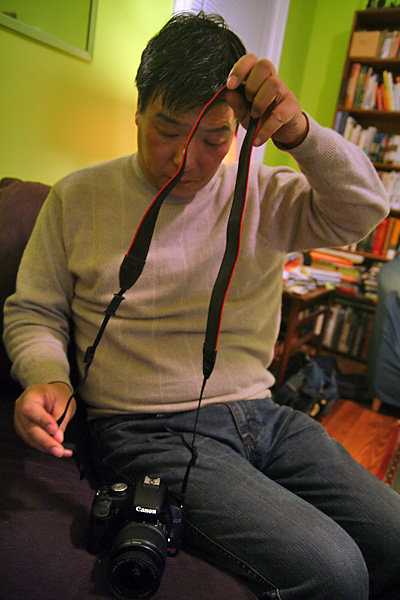 my roommate came back home close to 7:00. apparently he never received my e-mail alerting him to the arrival of his camera. i thought it was strange he wasn't playing with his new toy as soon as he saw it, until i learned he was charging up the battery. after dinner (he and his beef stew noodle soup, me with my can of baked beans) he finally brought out the rebel t1i (500D).