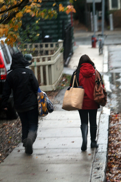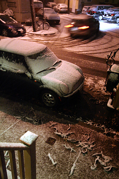 the temperature slowly dropped until by evening it finally reached the lower 30's the precipitation started coming down as snow. not really enough to shovel, maybe just kick off the sidewalk with my shoes. it'd already snowed once before in mid-october, but that was just a flurry, with nothing really sticking. tonight's storm was a more palpable demonstration that we're definitely kicking off the winter season now.