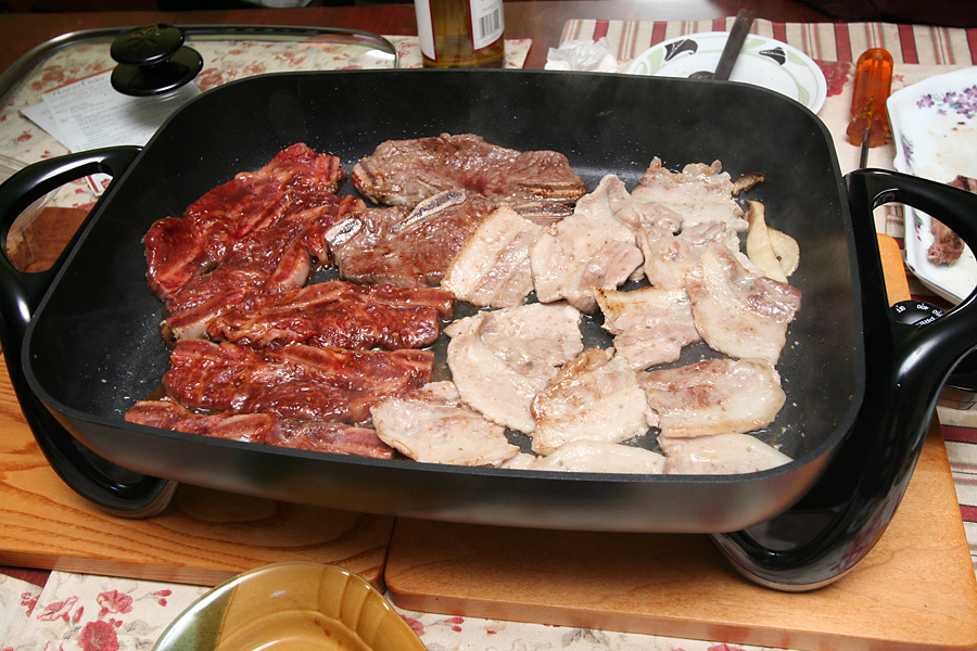 my mother bought an electric griddle and we had some korean barbecue when my father came back home in the evening.