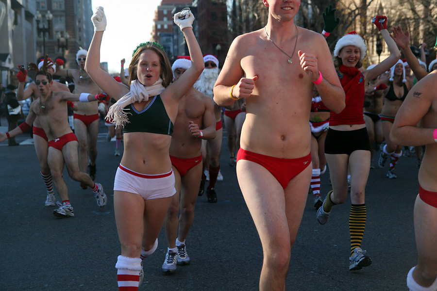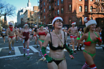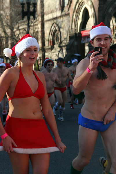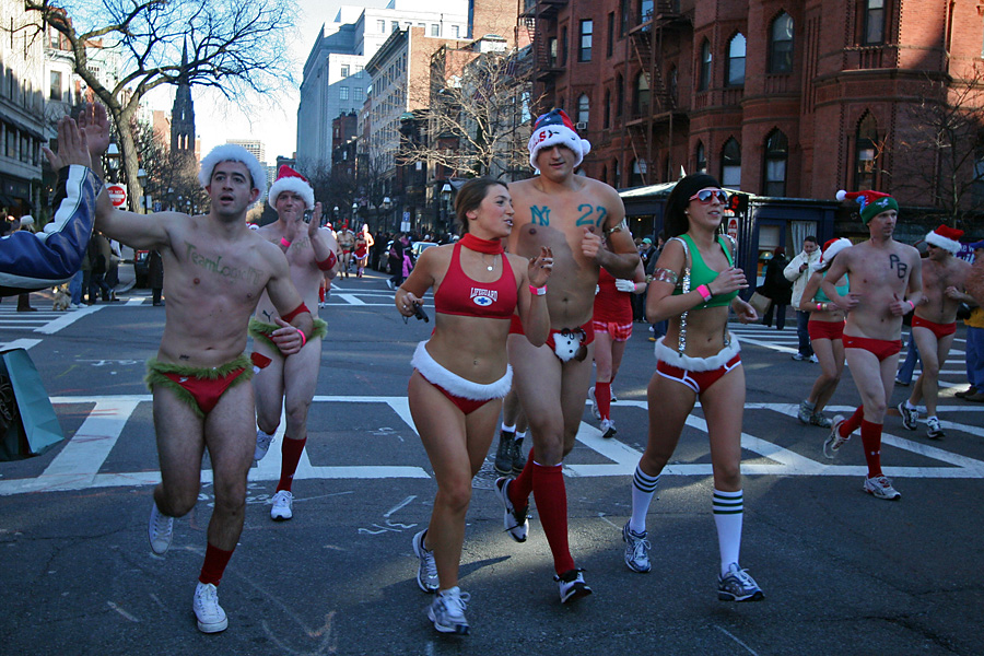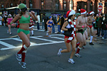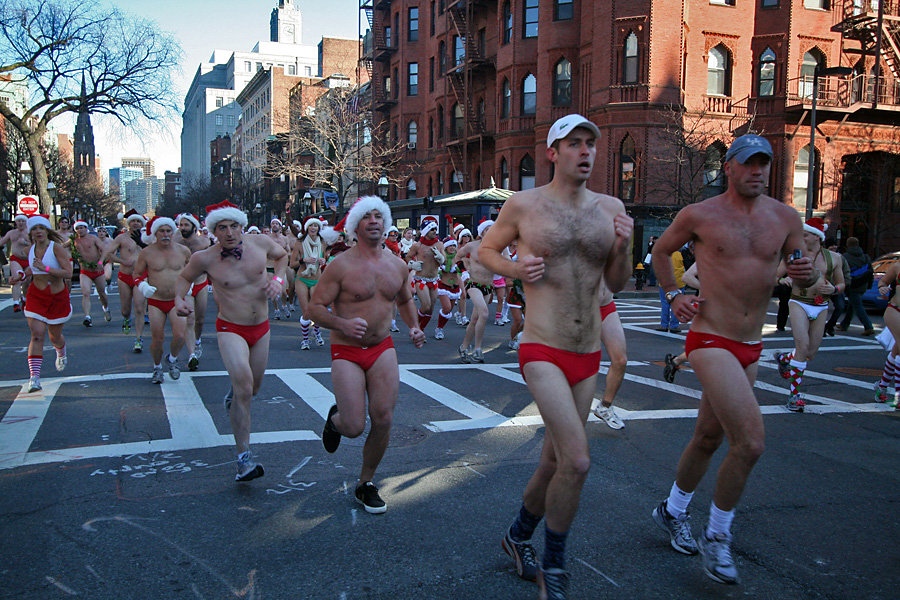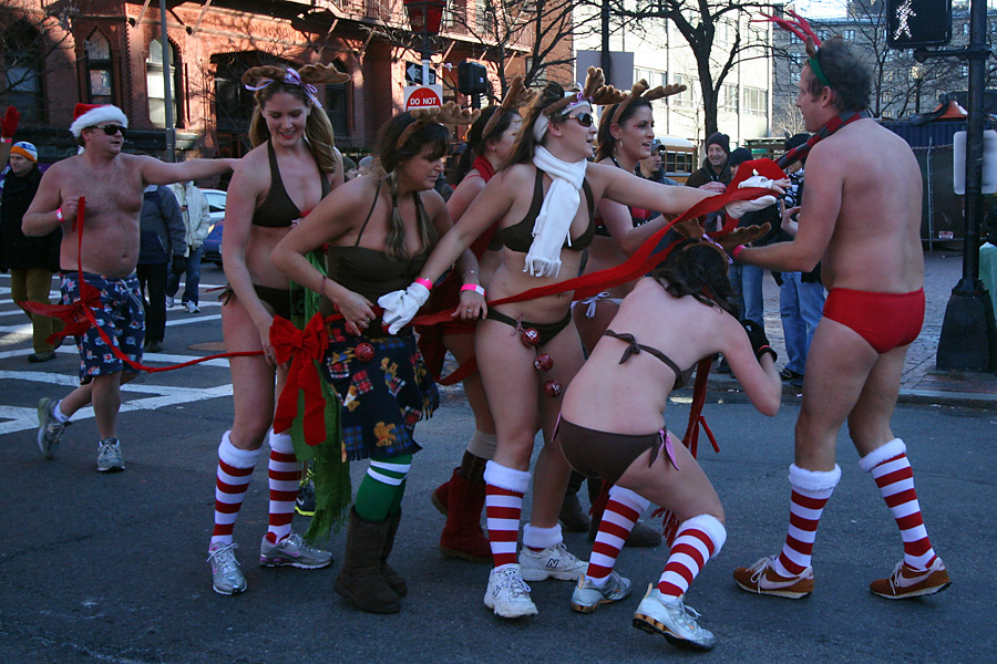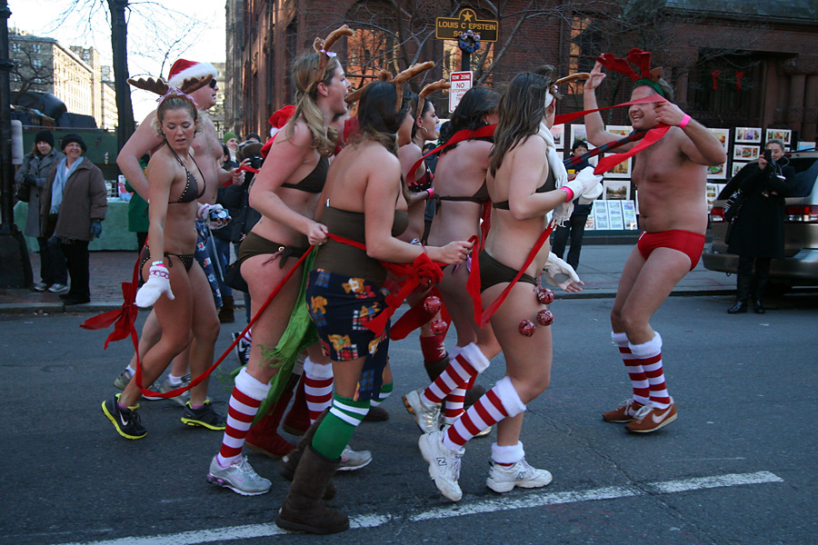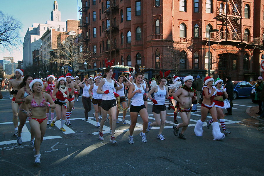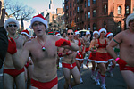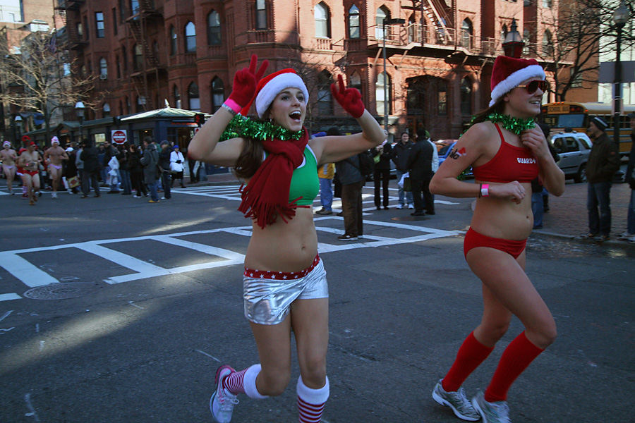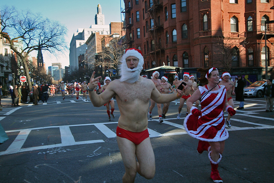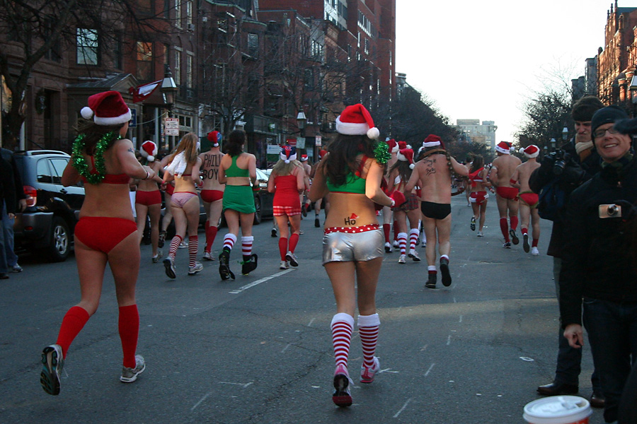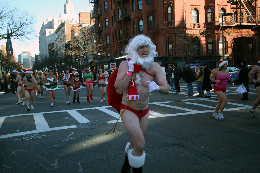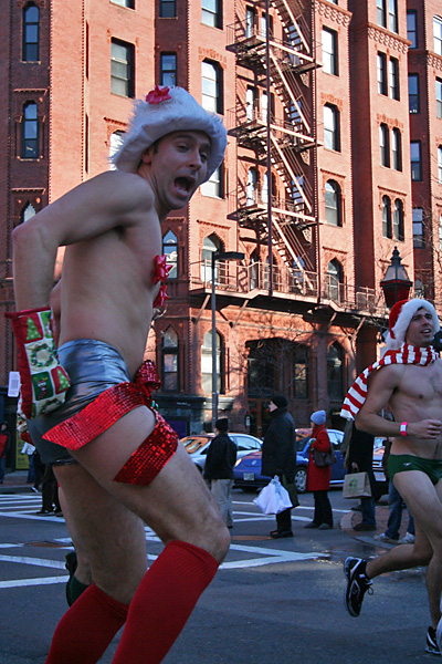 this is my 3rd santa speedo run (as an observer; 2007 & 2008). i began to fear it was somehow cancelled because there was still no activity when 1:00 rolled around. finally a few police officers arrived on the scene to direct traffic. the flow on dartmouth street was stopped, much to the consternation of angry boston drivers putting on a car horn symphony. a few just couldn't take it anymore and pulled illegal right turns despite the shouts of stop by the traffic police (too bad guns weren't drawn).