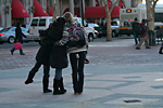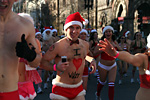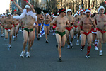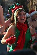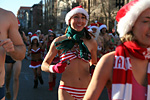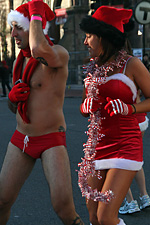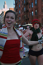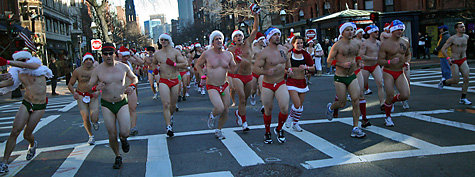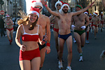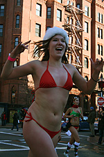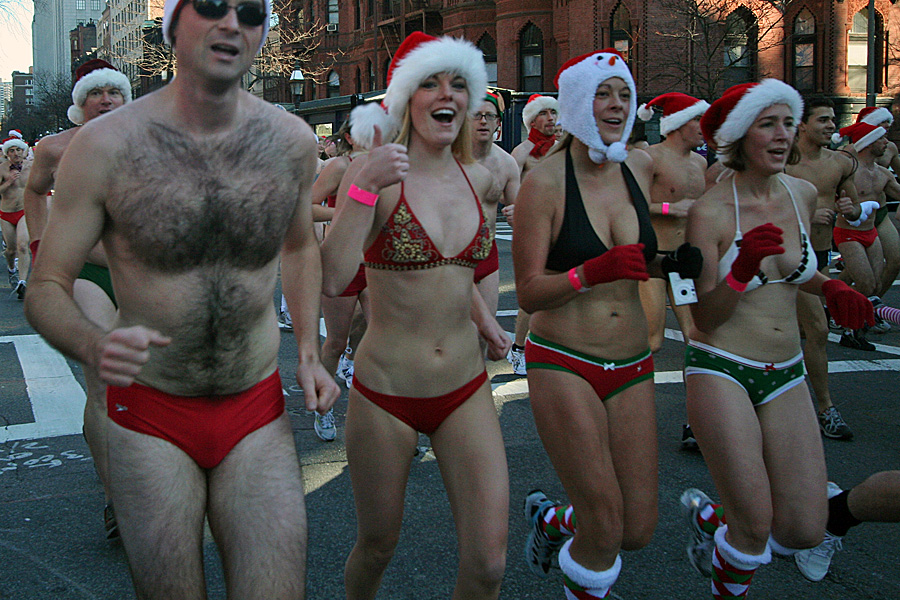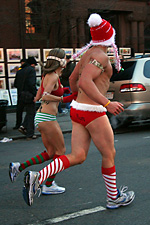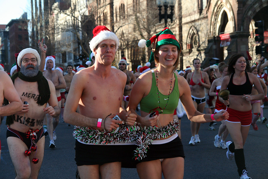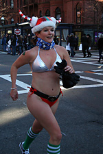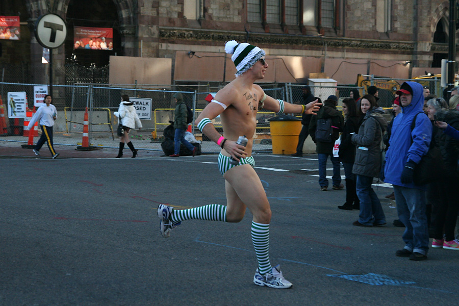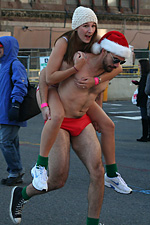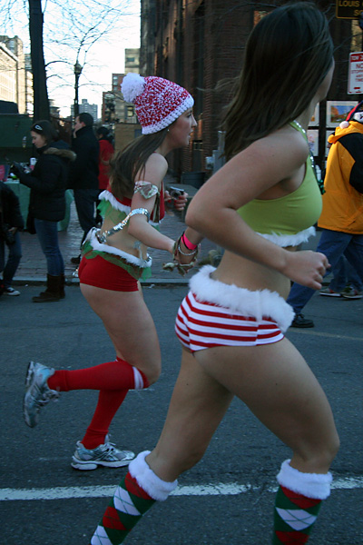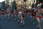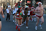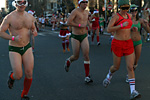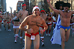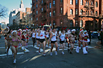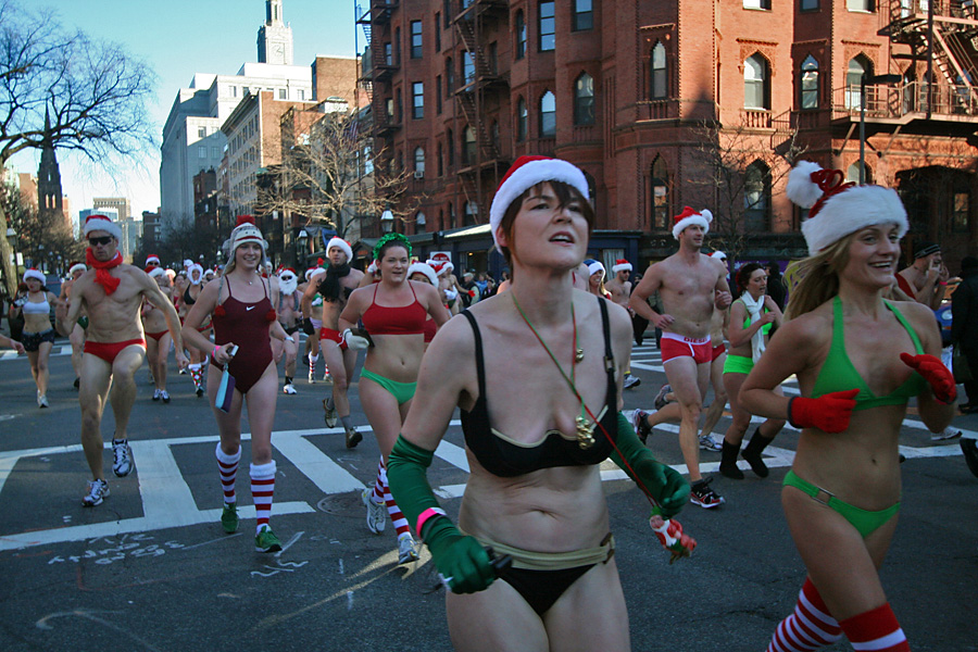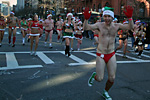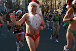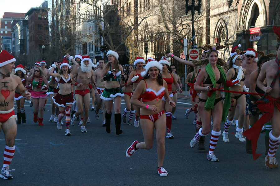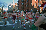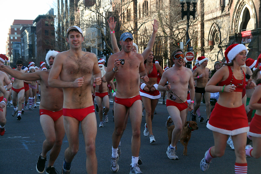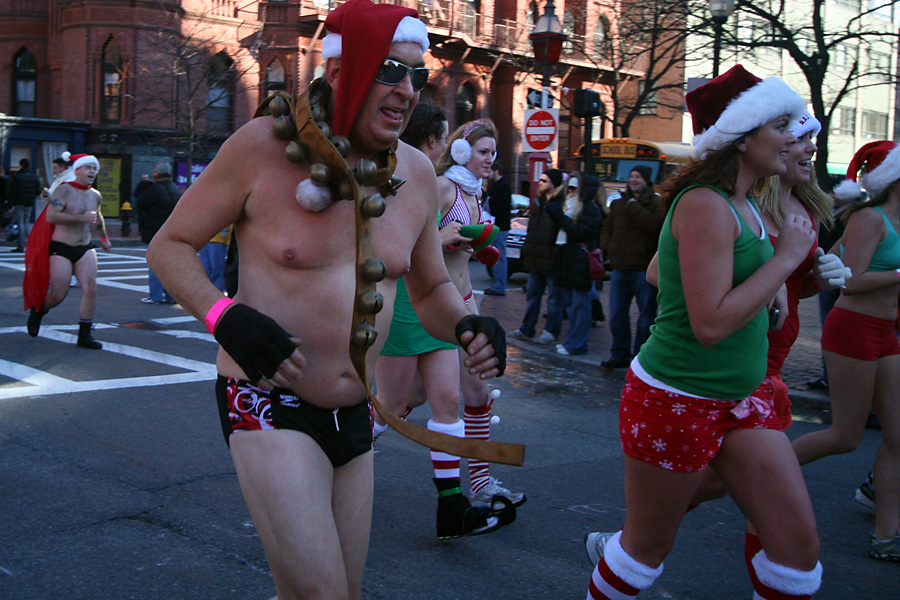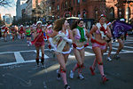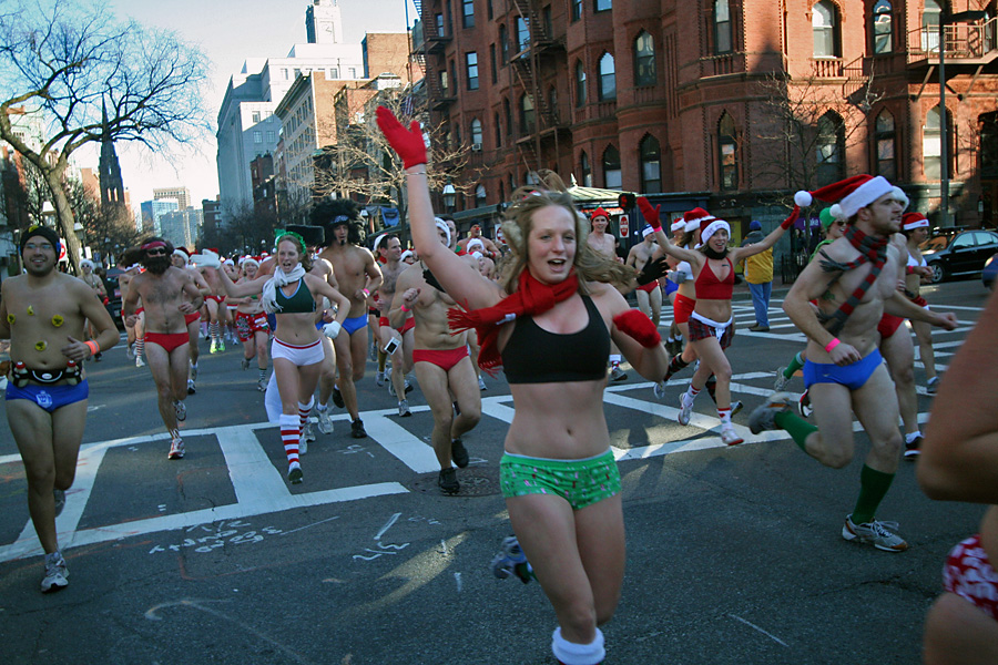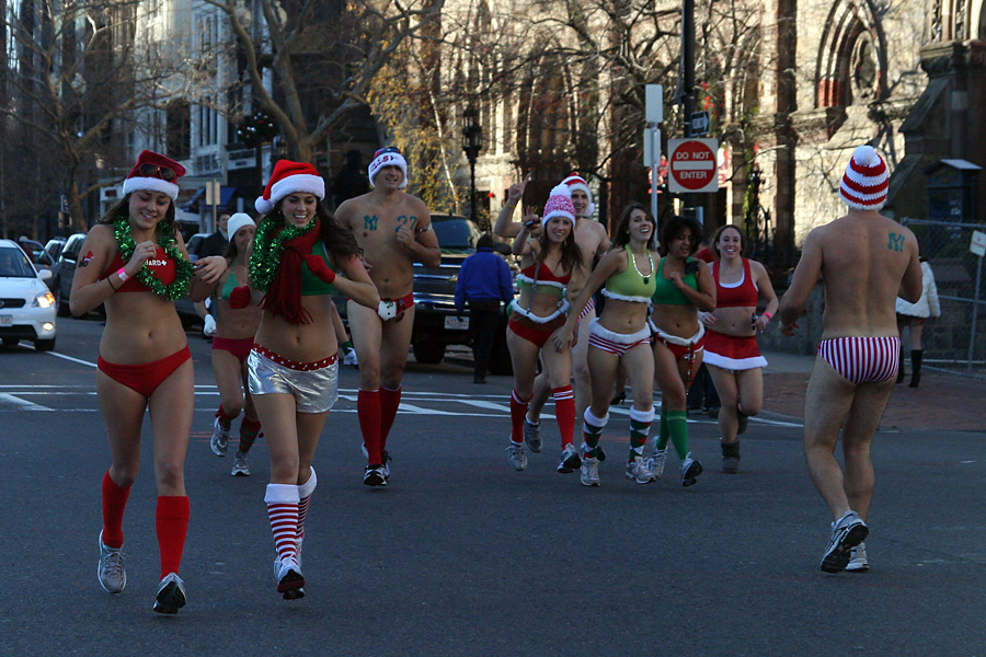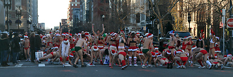 this is my 3rd santa speedo run (as an observer; 2007 & 2008). i began to fear it was somehow cancelled because there was still no activity when 1:00 rolled around. finally a few police officers arrived on the scene to direct traffic. the flow on dartmouth street was stopped, much to the consternation of angry boston drivers putting on a car horn symphony. a few just couldn't take it anymore and pulled illegal right turns despite the shouts of stop by the traffic police (too bad guns weren't drawn).