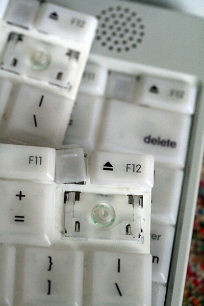 i also noticed that the exposed bracket on the missing delete key was also missing a pair of clips that secured the key to the keyboard. just out of curiosity i tried the 2nd keyboard. despite the mismatch, it still fit the old ibook perfectly. i reassembled the computer figuring my job was done, until i noticed that a handful of keys on the upper left corner of the keyboard were dead.