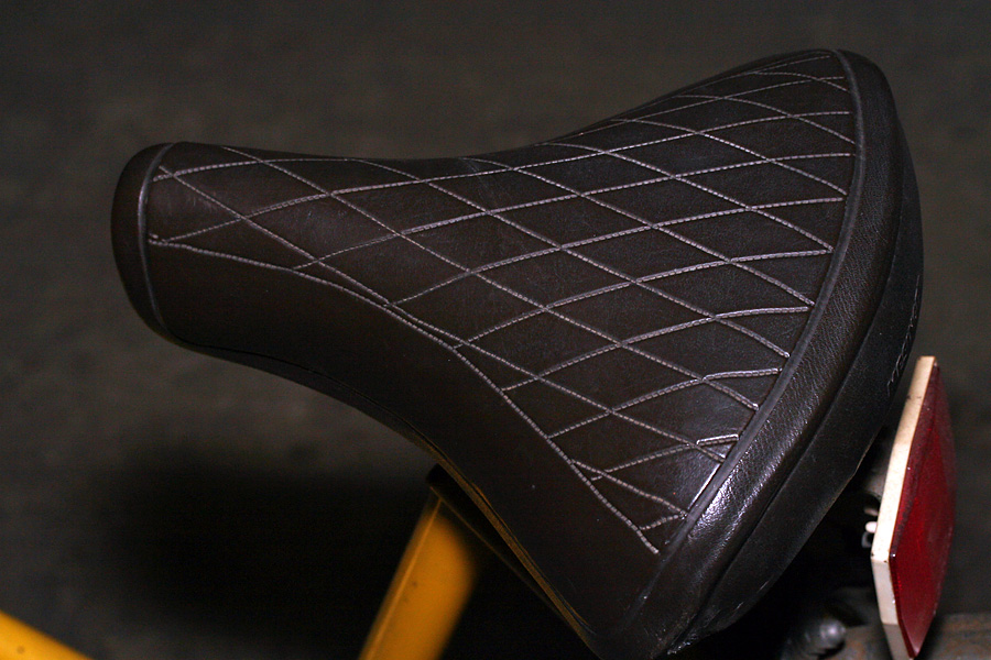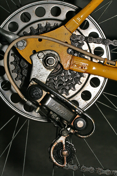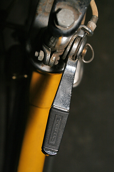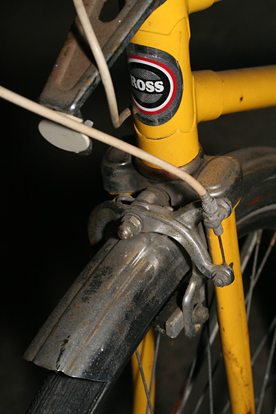 i went down to the basement to take some photos of the two old bicycles. one of them i just call "the yellow bike." somebody had thrown it in front of my house many years ago. it sat there for a few days, and when nobody claimed it, i brought it down to my basement (it later moved to belmont, and now lives below the cafe). it's a ross brand bike, built in allentown, pennsylvania probably in the 70's or 80's. i never heard of the brand before, but according to wikipedia, they used to be the 3rd largest domestic manufacturer of bicycles behind huffy and schwinn. it has a single-piece crankset and a 5-speed derailleur drive. shifting is done from a lever mounted to the head tube. i was surprised to learn the bike uses a shimano brand drivetrain. repair work on the bike includes replacing the rear brake cable and readjusting the handlebar (misaligned). the shifting may also need some adjustment as well.