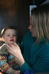 knocking on the glass to get the attention of a woman who left her package behind. eliza got here a little late but i didn't mind, passing the time with the overhead television tuned in to NECN, and a copy of buy baby buy in front of me, the book i wanted to give to eliza. she pushed a stroller with little theo wrapped inside a cozy cocoon. i'd seen him a few times before, but when he was still a baby. now at 1.5 years old, he was a more grown-up toddler. he seemed like a serious child, prone to staring at things with this intense concentration, only to snap out of it with demands for food or attention. he had a very infectious smile, and reminded me a bit of philip seymour hoffman for some reason, with a dash of matt damon.
