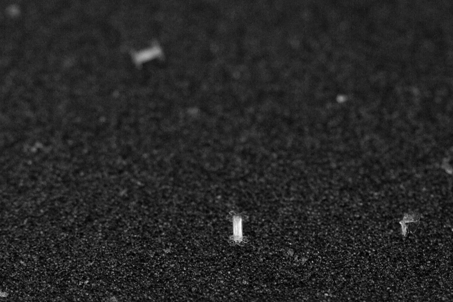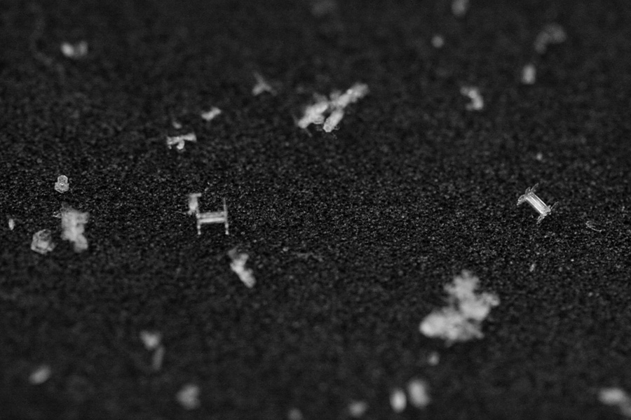 it stopped snowing in the afternoon after about 3" of precipitation. it stayed calm for the rest of the evening, although the bulk of the snow will arrive later at night while everyone is asleep. earlier i'd gone out and taken some snowflake photos. these weren't the classic snowflake shapes, but rather needles, plates, and capped columns.