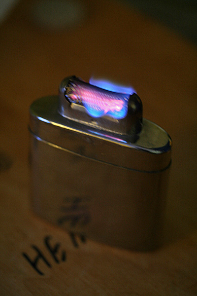 when my father came home, we tried to light that metal hand warmer of mine. he had some coleman white gas in the garage, which is the kind of fuel used in burning lanterns. after pouring some white gas into the flask, we put back the burning element. after a few squirts of white gas into the element, we lit the element. it went up in a big flame at first, but soon subsided to a glowing burn. we put the lid on the hand warmer and slipped it inside the cloth pouch.