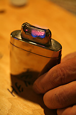 my father tried to seal the dent with some solder but the melted metal just wouldn't bond to the chrome finish. i was afraid the hand warmer would explode because there was still some fuel inside and the thing started to warm up fast from the soldering needle. at this point the hand warmer is probably a lost cause. i'll probably go buy another one though, one with a platinum catalyst that doesn't actually release flames.